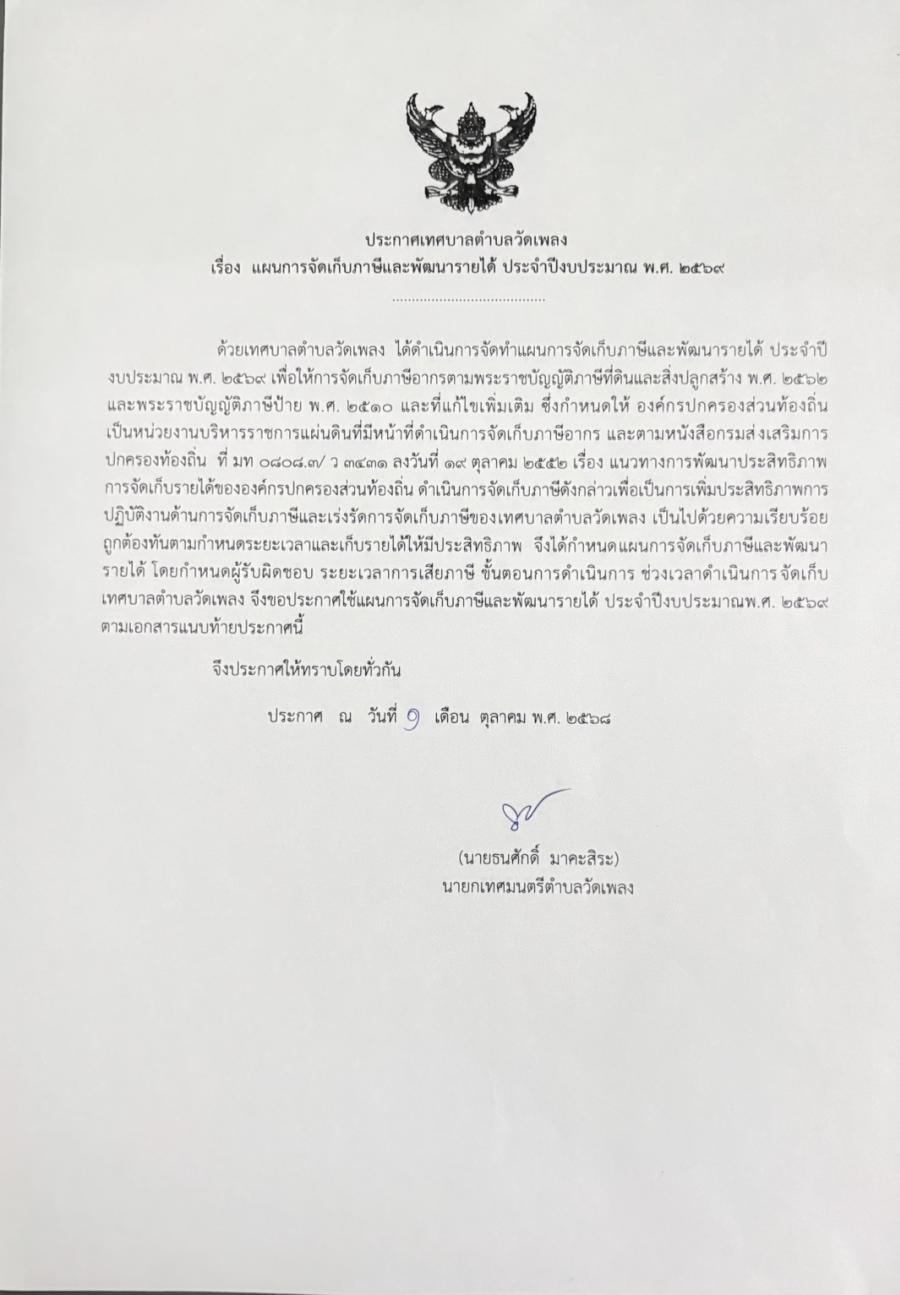 ประกาศเทศบาลตำบลวัดเพลง เรื่อง แจ้งเตอนผู้ค้างชำระภาษี ประจำปี พ.ศ.2568