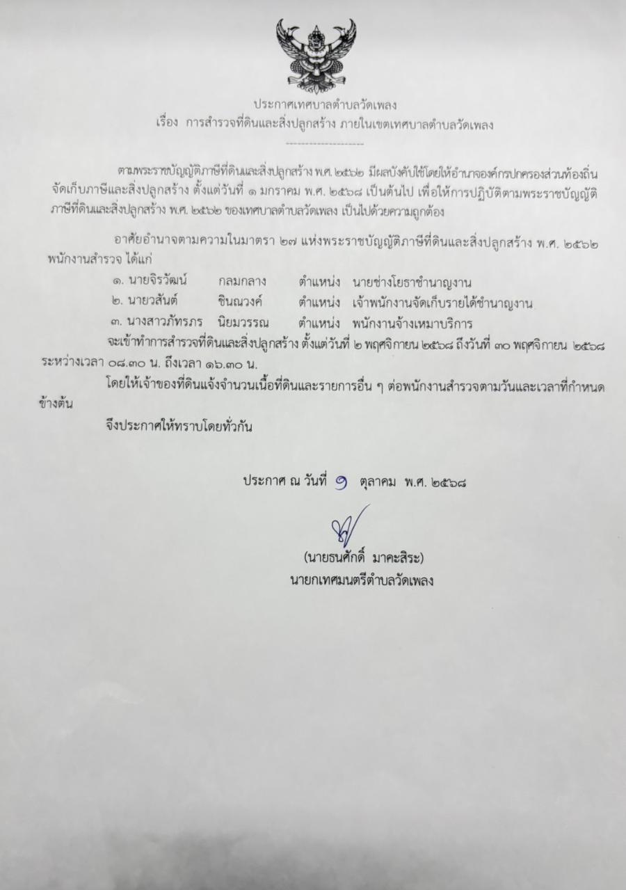 การสำรวจที่ดินและสิ่งปลูกสร้าง ภายในเขตเทศบาลตำบลวัดเพลง ประจำปี พ.ศ.2569