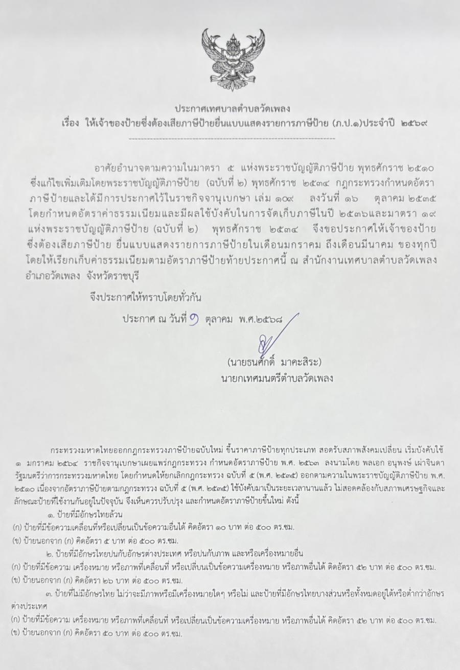 ประกาศเทศบาลตำบลวัดเพลง ให้เจ้าของป้ายยื่นแบบแสดงรายการภาษีป้าย (ภ.ป.1)ประจำปี 2569
