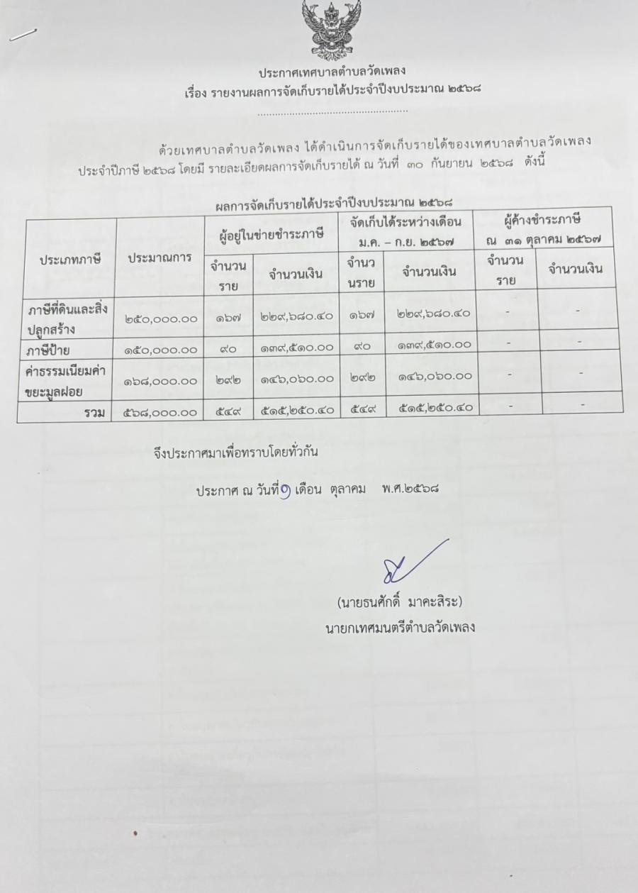 ประกาศ เรื่อง ราบงานผลการจัดเก็บรายได้ประจำปีงบประมาณ 2569