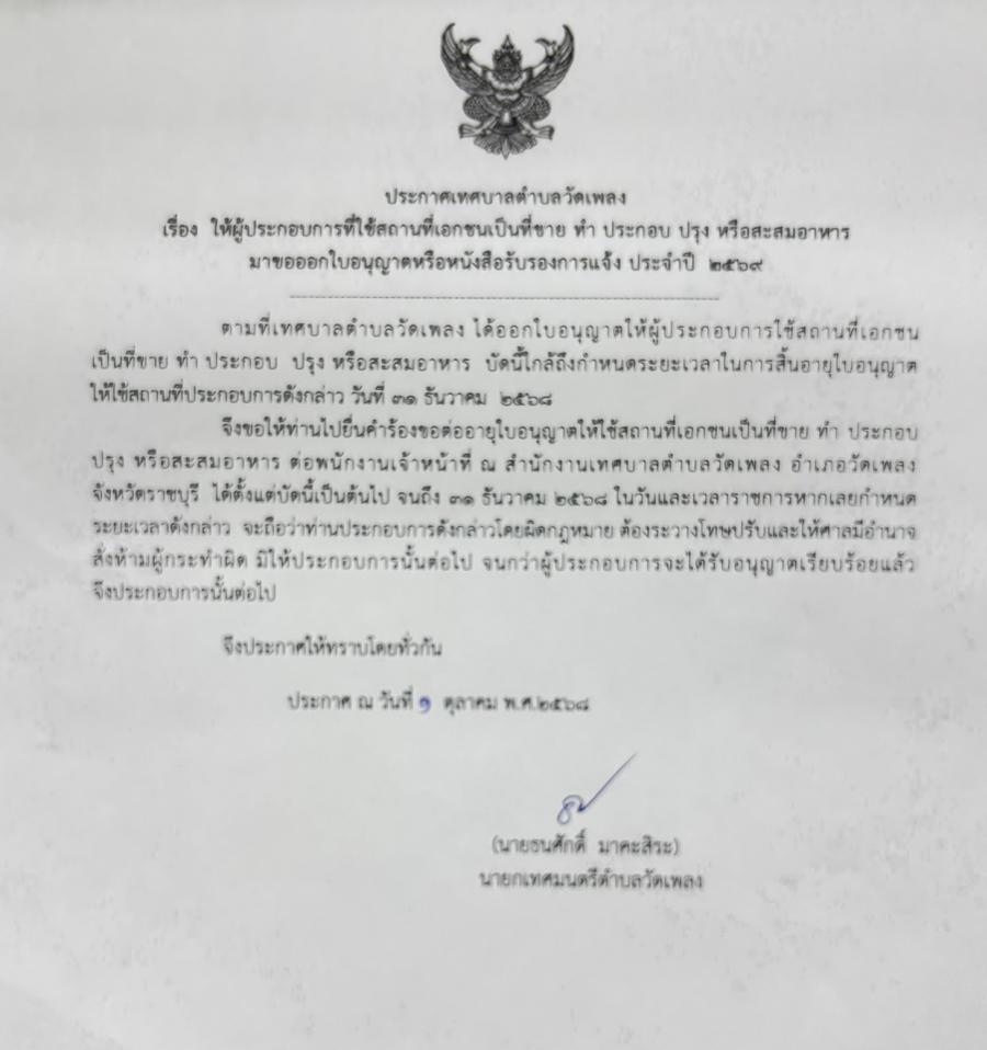 ประกาศ เรื่อง ให้ผู้ประกอบการที่ใช้สถานที่เอกชนเป็นที่ขาย ทำ ประกอบ ปรุง หรือสะสมอาหาร มาขอออกใบอนุญาตหรือหนังสือรับรองการแจ้ง ประจำปี 2569