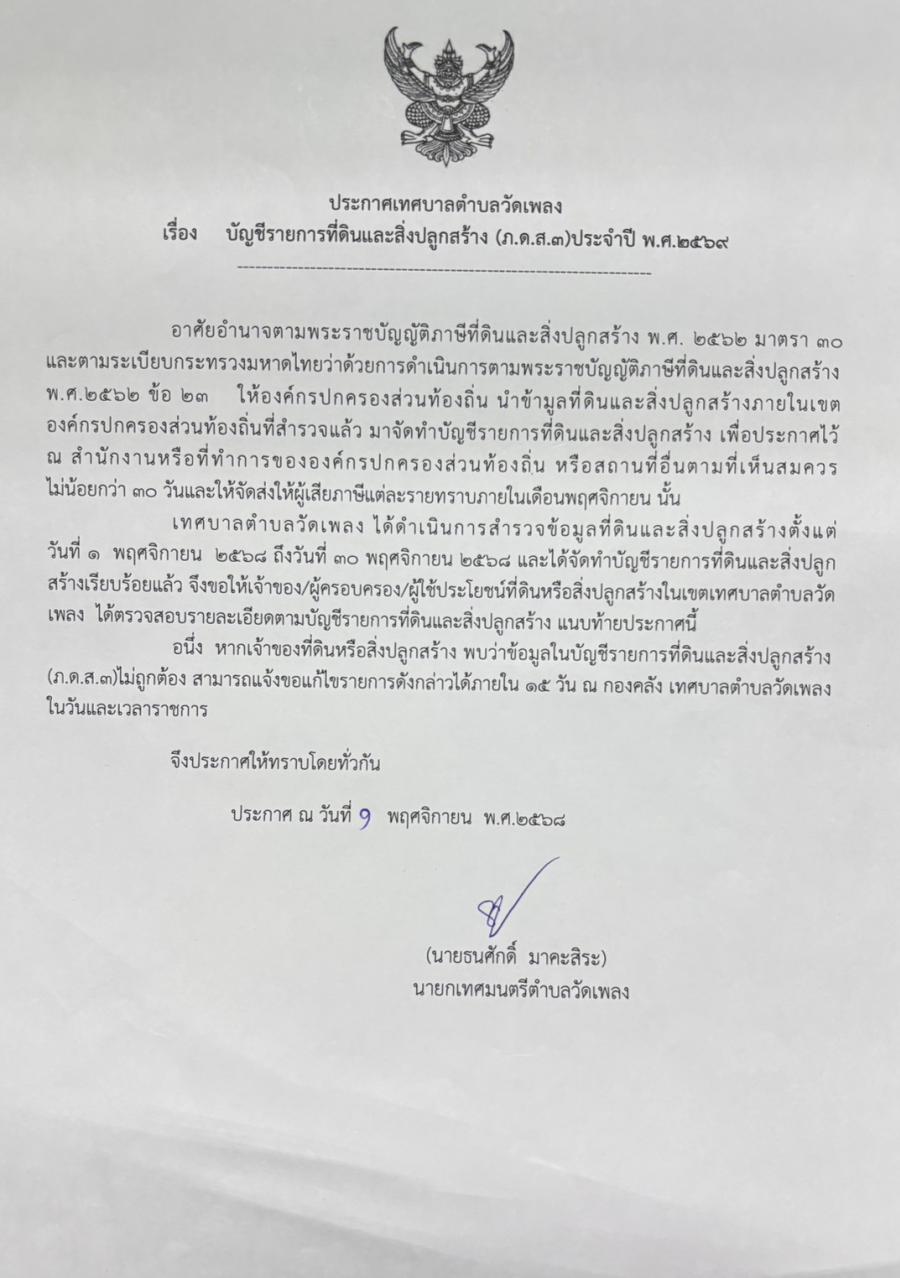 ประกาศ เรื่อง บัญชีรายการที่ดินและสิ่งปลูกสร้าง (ภ.ด.ส.3)ประจำปี 2569