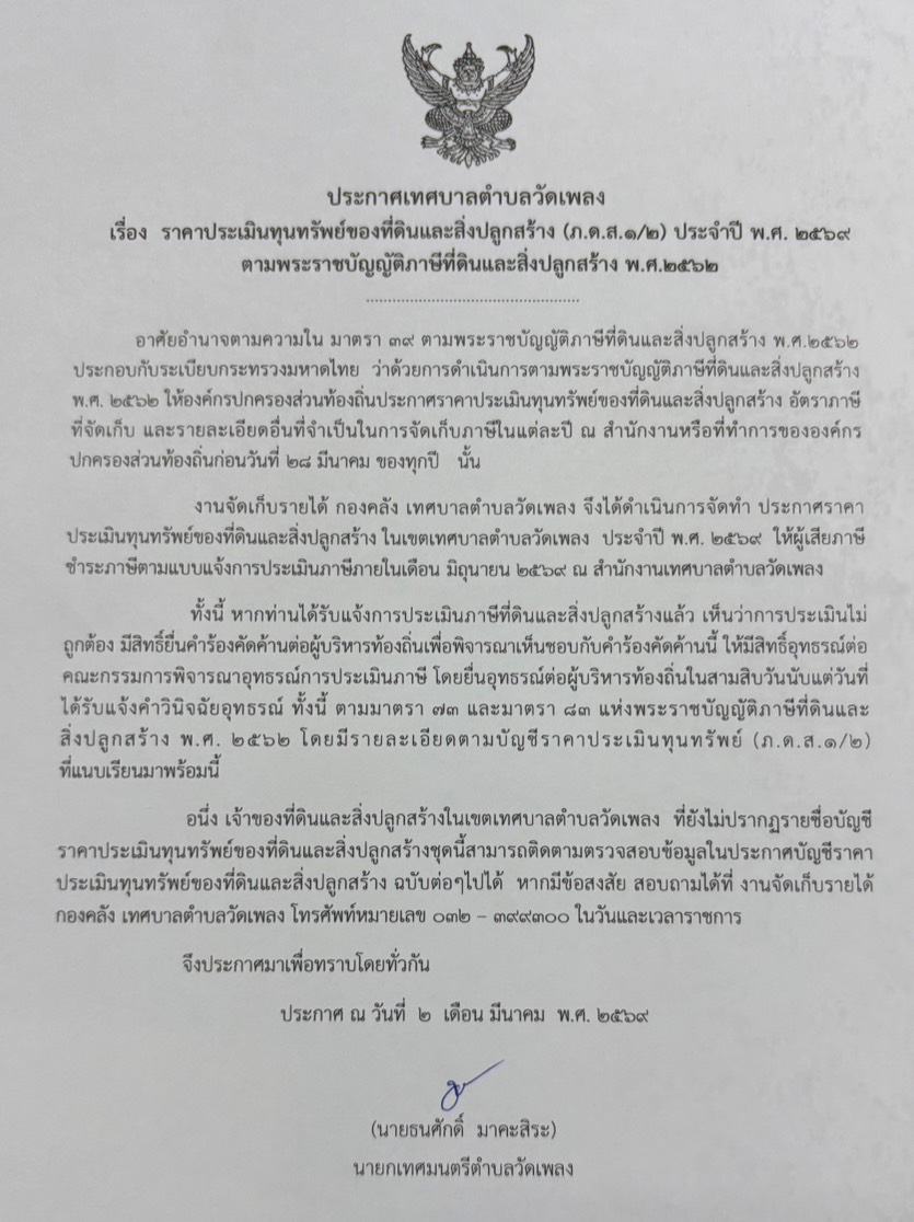 ประกาศ เรื่อง ราคาประเมินทุนทรัพย์ของที่ดินและสิ่งปลูกสร้าง (ภดส.1/2) ประจำปี 2569